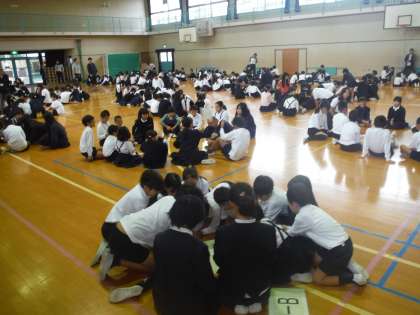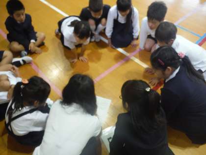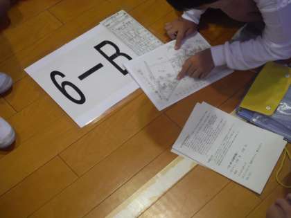 明日予定しているオリエンテーリングに備えて、たてわり班で目的やコースの確認を行いました。