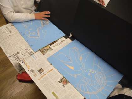 作品展に出展する作品で、版画用の水溶性インクを使って色を付けていきました。