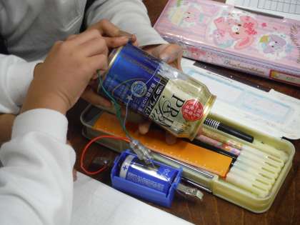 過日の研究授業「電気で明かりをつけよう」の実験で、どんなものが電気を通すかを調べました。その続きとして、アルミ缶やスチール缶等について、調べてみました。