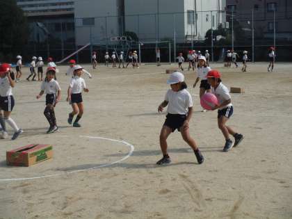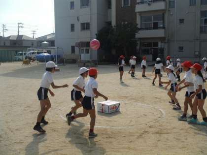 合同体育を行いました。二手に分かれて、ボールをエリア内にある段ボールにあてるゲームをしました。