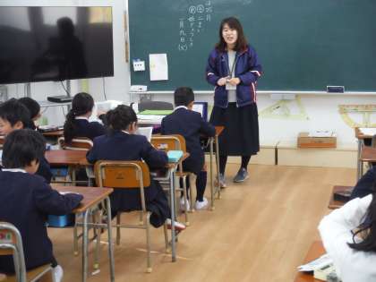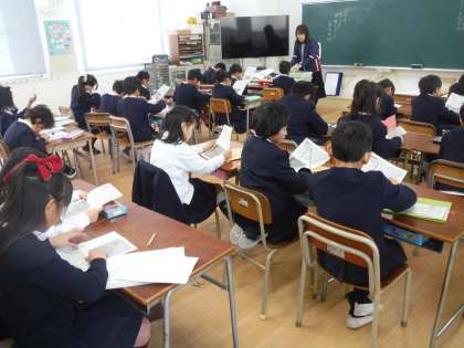 (その1)「食育通信」や「学校だより」などの配布物を受け取った後、説明を聞きました。