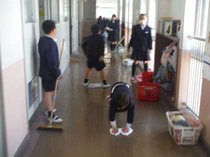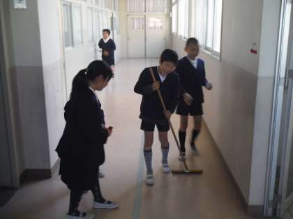 明日の「卒業を祝う会」を前に、たてわり班の全児童で校内の隅々まで清掃をしました。