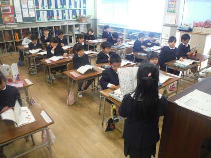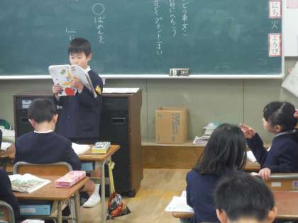「スイミー」について、「ぼくは(わたしは)○○番目を読みます。○○して読みます。」と、言ってから発表しました。