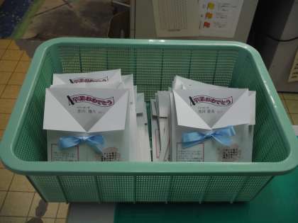 保健室の先生が、成長の記録を作ってくださいました。リボンの長さが、身長の伸びを表しているそうです。
