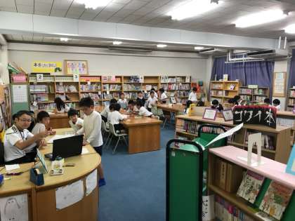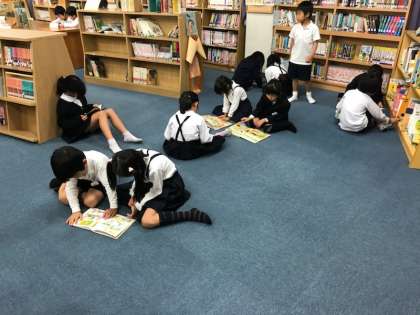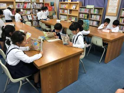 たくさんの児童が図書室を訪れ、読書に親しんでいます。