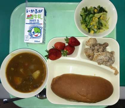 フライドチキン カレーシチュー 春のカラフルソテー いちご 黒糖パンが出ました。
