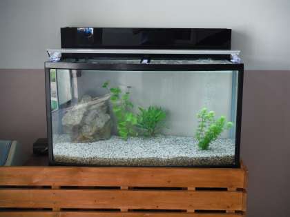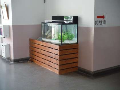 夏休み、管理作業員さんに水槽を設置してもらい熱帯魚を入れていただきました。
