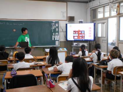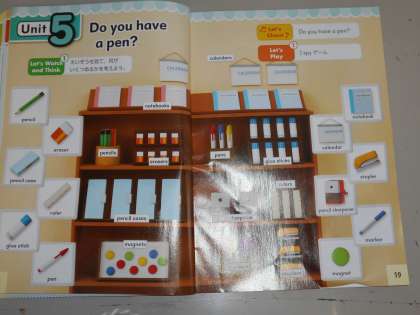 映像を見て、何がいくつあるかを考えていきました。Do you have a pen?という言い方を使って、いろいろな文房具の単語を覚えたり、複数の言い方を学習したりしました。