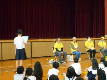 お世話になっている地域の方々へ感謝の手紙を贈呈しました。児童会の人たちが司会や進行等の役割を担い、進めていました。暑い中で久しぶりの講堂に集合しての集会でしたが、おしゃべりすることもなく、きちんとした姿勢で取り組めていました。