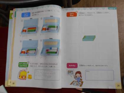 「文房具絵カードを並べて、文房具セットを作り、伝え合おう」という学習をしました。教科書巻末の絵カードを切って、自分の好きな文房具セットを作り、それを英語で伝え合いました。