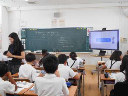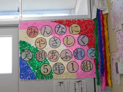 教室の掲示板には、学級目標と平和学習をしたあとに折った鶴が飾られていました。