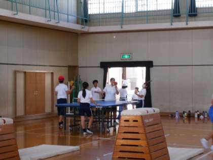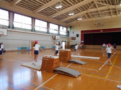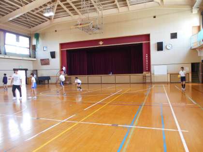体育は講堂で、「ボール運動」「バドミントン」「卓球」「マット運動」「とび箱」と自分の好きな運動を進めていました。苦手なとび箱を頑張る子もいました。