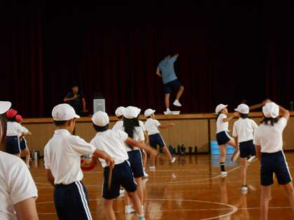 運動会の団体演技で行う、「エイサー」に少しずつ取り組んでいます。さすが4年生、1回で基本的な流れを覚えていました。
