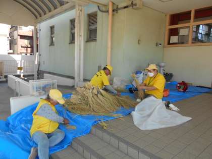 見守り活動や学校の栽培活動などについてボランティアで助けてくださっている「愛育会」の方々が学校で作った稲を脱穀してくださいました。