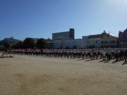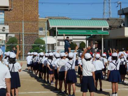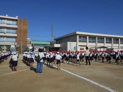 運動会に向けて全体練習に取り組みました。並び方の練習のあと、運動会の歌「ゴーゴーゴー」を赤白に分かれて歌いました。