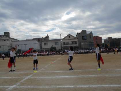1年の団体演技です。いろいろな色のハンカチをひらひらなびかせて、きれいな56人の花を咲かせました。