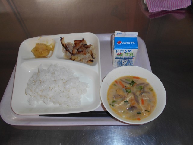 ごはん、牛乳、鶏肉の塩こうじ焼き、かす汁、栗きんとん