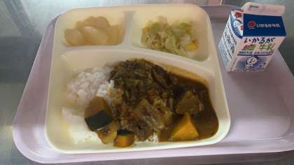 今日の給食は、主菜が夏野菜のカレーライスでした。(給食はレトルトではありません