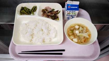 ごはん、牛乳、豚肉のしょうがやき、さつまいものみそ汁、きくなとはくさいのごまあえ