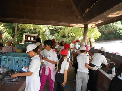 野外炊事のあとの片づけをしました。たき火のすすをクレンザーで磨いたり、食器をもともとあった数にきちんとそろえたり、水滴をふいたりとすることがいっぱいです。みんなで協力して全班合格をもらいました。よく頑張りました。