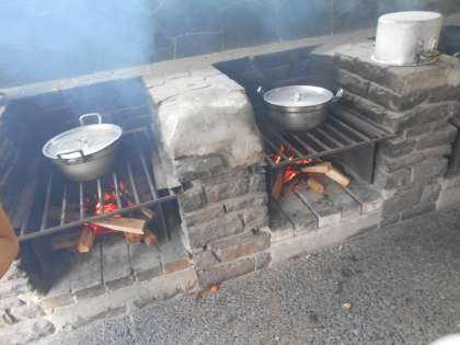 野外炊事はカレーライスを作ります。炊事場へ移動して作り方の説明を聞きました。火おこしが大変で、すぐ消えてしまったり、けむりやすすで困ったりの悪戦苦闘でした。