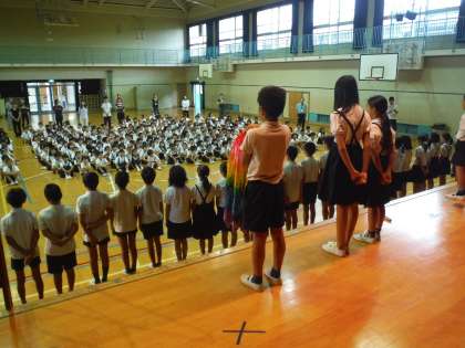 児童集会で、6年生が広島修学旅行に向けて「平和宣言文」を全校児童に伝えました。