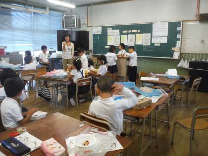 その後、たてわり班でつるを折りました。つるを折るのは難しかったようですが、折り紙が得意な子や、上級生がていねいに折り方を教えている姿がたくさん見られました。