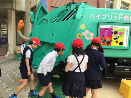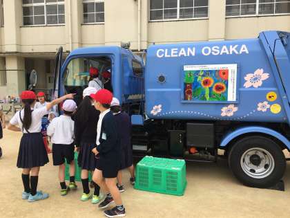 5月9日(木)に、4年生の出前授業がありました。大阪市環境局の西北環境事業センターの方々に来ていただき、パッカー車やゴミの分別の仕方について教えて頂きました。普段知ることの出来ないパッカー車の仕組みや、楽しい紙芝居や劇、クイズをしていただき、子ども達は意欲的に学習していました。