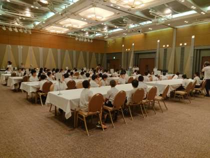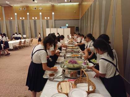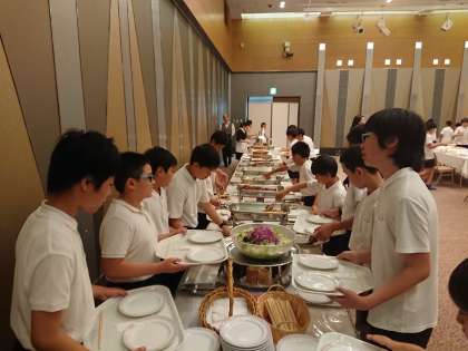楽しい夕食の時間です。メニューは唐揚げ、エビフライ、フレンチフライの他、豊富にあります。カレーはホテルならではの味です。デザートやアイスクリームもあり、大満足の夕食でした。