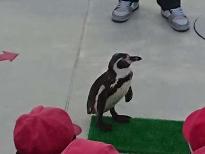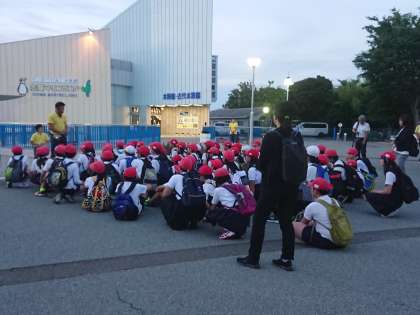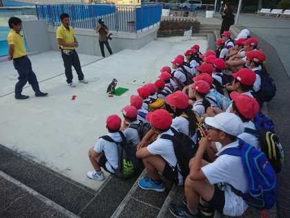 夜の水族館でクラスごとに、フンボルトペンギンへのタッチと魚へのえさやりをしました。