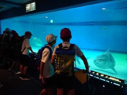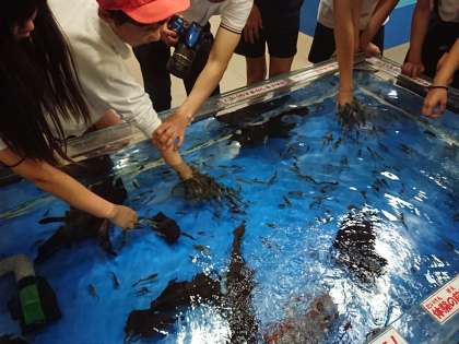 水族館の館内には、マンボウなどの珍しい魚をはじめ、たくさんの魚がいました。また、ドクターフィッシュや伊勢エビなどの魚介類を触ることができました。