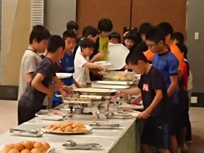 楽しい朝ごはんです。スクランブルエッグ、ハム、ソーセージ、パン、野菜の田舎煮、鯖の塩焼き、味噌汁ごはんなど、豊富なメニューです。デザートもあります。お腹いっぱい食べてしまいます。