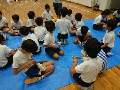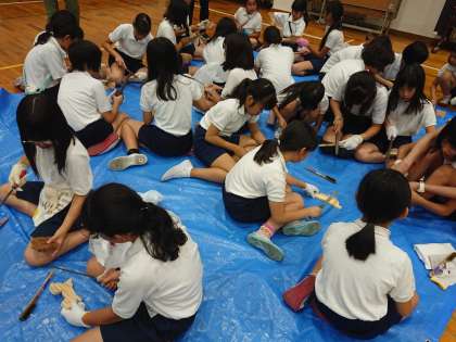 の順で、ひもをつけて完成です。みんな個性あふれる作品となりました。おみやげに持って帰ります。