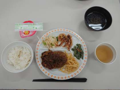 メニューはトマトソースハンバーグ、イカフライ、ごはん、りんごゼリーなどです。