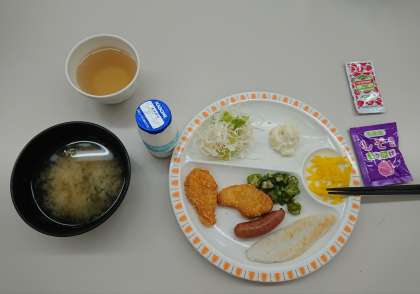 メニューは、ウインナー、チキンナゲット、オクラ、かまぼこ、みそ汁、ごはんなどです。