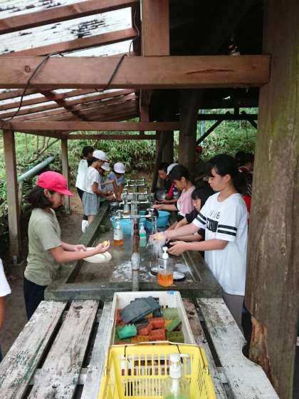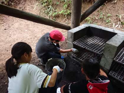 おいしくいただいた後は、後片付けをしました。かまどの掃除や食器類を洗いました。チェックが厳しく、一生懸命磨きました。