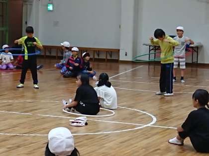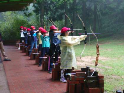 雨が降っていますが、アーチェリーはできました。クラスごとに体育館での遊び(ドッジボールやフラフープなど)と交代して楽しみました。
