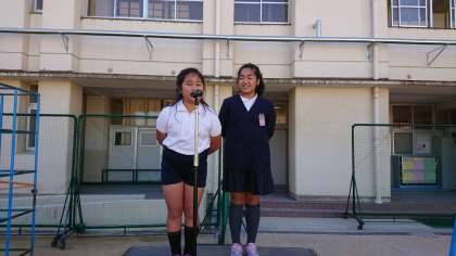 朝の児童朝会の時に、健康委員会が全校児童を対象に、良い姿勢で授業を受けるための合言葉「ぺったん ぴん ぐう」を使って、ポイントを知らせました。