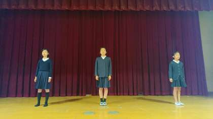 本番は11月26日(火)の児童集会ですが、今週から15分休みの時間に、講堂で配役ごとに練習を行っています。写真は、「睡眠忍者」役の児童が練習をしています。衣装も作って、セリフもポーズもほぼ完ぺきに覚えています。本番は、大きな声で堂々と演じることを目標にがんばります!!