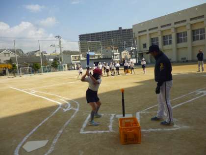 12月12日(木)、オリックスバッファローズ球団のOBの方々が、出前授業で小学校を訪問してくださいました。始めにバッティング、守備練習を行いボールに慣れた後、各クラスでTボールゲームを行いました。みんな夢中になってボールを追いかけ、たいへん楽しんでいました。