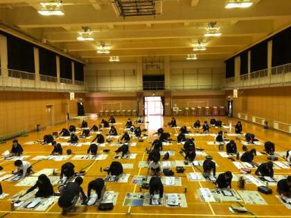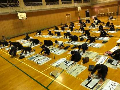 おごそかな雰囲気の中、みんな姿勢を正して集中して書道に取り組みました。