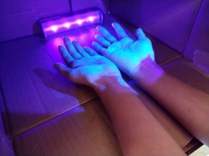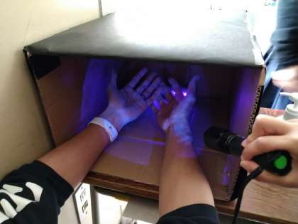 ブラックライトの光に反応するローションを両手にぬり、いつも通り手を洗います。その後、ブラックライトの光を手に当ててみると、手の一部分に白く光っているところがあります!ズバリ洗い残しです!!