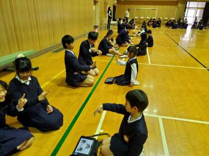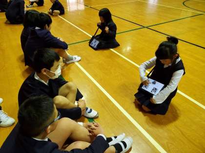 国語科の「話す、聞く」の領域で、新しいじゃんけんを考え、それをわかりやすく説明するという学習をしました。これまで1年生同士で説明し、よかったところを見つけて相手に伝えるという活動をしていましたが、今日は6年生に聞き役になってもらいました。6年生は、話す時の目線や口の開き方など、よかったところを見る視点も多く、1年生にとってとてもよい学習になりました。6年生もまた、話す時の基本を思い出してくれたここと思います。お互いに楽しそうにじゃんけんをする姿は、微笑ましかったです。