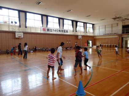 7月27日の午前中、PTAと共催で佃カーニバルをおこないました。低学年と高学年に分かれて、プールや体育館でミニゲームを楽しみました。子どもたちと大人のスタッフを合わせて約200人の参加があり、大いに盛り上がりました。