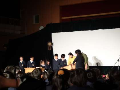 12月22日、講堂におきまして「影絵劇」の鑑賞会をおこないました。「ゲゲゲの鬼太郎」を見ました。いろいろな妖怪が現れる中、友だちを思う気持ちをテーマに物語が展開しました。また、後半は代表の子どもたちが効果音づくりに取り組むというワークショップをしました。どの子も見事な音づくりができました。2学期終わりの楽しいイベントになりました。