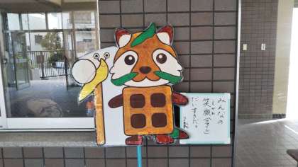 玄関を入ったところのピロティで、つく来夢がにこやかに子どもたちの登校を出迎えてくれています。子どもたちが元気に挨拶して登校してくれるのを出迎えています。