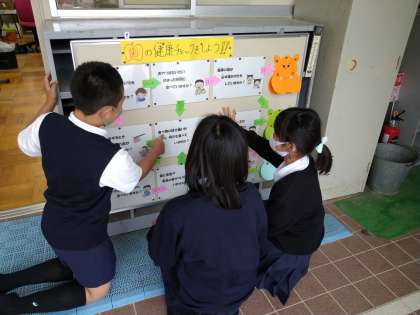 休み時間になると、子ども達が友達と一緒に歯の健康チェックにやってきます。