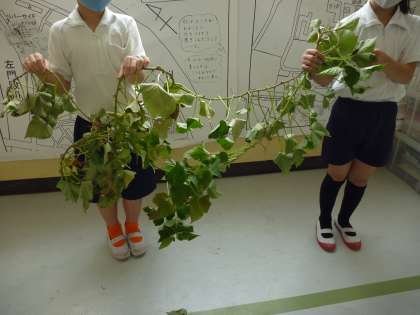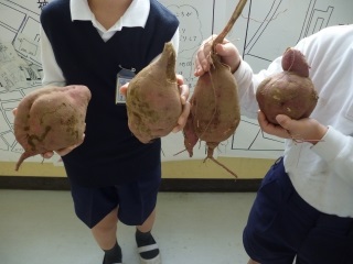 11月6日(金)、生活科の学習で1学期から育てたサツマイモを収穫しました。まず、自分たちの身長ぐらいに伸びたつるを引っ張ってぬき、つるの先にイモがないか探しました。その後、イモを傷つけないようにていねいに掘りました。大きなイモやかわいい赤ちゃんのイモを掘り出して、大喜びでした。