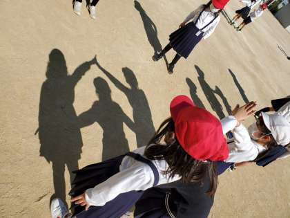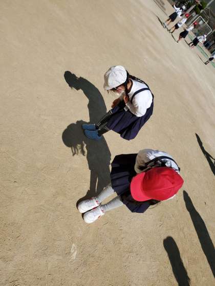 体全体を使い、影が何の形に見えるか考えました。友だちと影を組み合わせて王冠や数字を作っている子もいました。いろいろな形を作ることができて喜んでいました。また、影踏み鬼ごっこもしました。暖かい日だったので、みんな汗をかきながら楽しそうに運動場を走り回っていました。