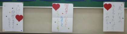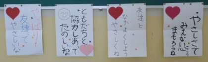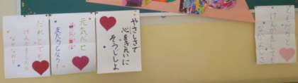 5月10日(月)に実施した「いじめについて考える日」の取り組みの一つとして、児童会の代表委員児童が標語を作り、校舎内の階段掲示板に掲示しました。わたしたち、一人一人が互いについてよく理解し合い、相手の立場に立って考えるとともに、「いじめは絶対に許されない行為である」という認識を深め、「いじめ防止」の意識を高めていきたいです。